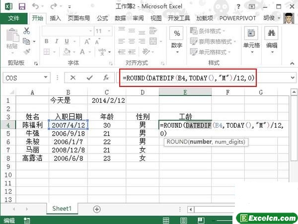 用DATEDIF及ROUND函数在Excel2013表格中计算员工的工龄