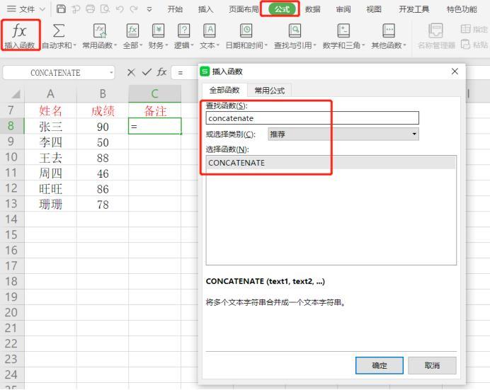 在表格中的菜单栏内点击[公式],选择[插入函数],在弹出的对话内查找函数公式:concatenate,之后选择公式,点击[确定]即可。