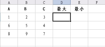 1、打开一张演示样表,如下图。“最大”列存储A到C列中最大的数据,“最小”列则存储最小的。
