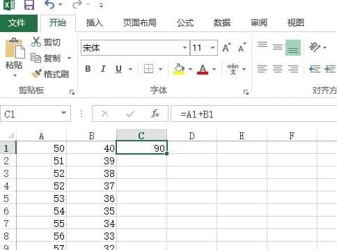 滑鼠选取C1单元格,然后在C1单元格中输入'=A1+B1',输入完后将键盘上的回车键放下就可以得到结果。