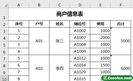 这需要一个强大的Power Query数据清理工具,它的优点是不破坏源数据表的结构和内容。我们只需要把这个表作为Power Query的数据源表,取消Power Query中的合并单元格,把每个商家的店铺合并成一个单元格,暂停分开,把每个商家的费用合计一下,就可以把这个清理后的表作为Word邮件合并的数据源了