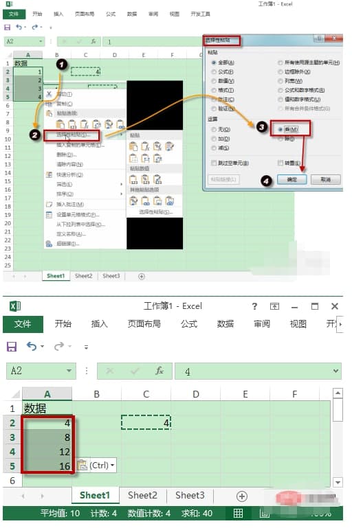 2、按下组合快捷键Ctrl+C复制C2单元格,然后选择要批量加或者乘的单元格区域,右键→选择性粘贴,在弹出的“选择性粘贴”对话框中选择“运算”下的具体运算,如“乘”或者“加“,然后单击”确认“即可。如下图所示
