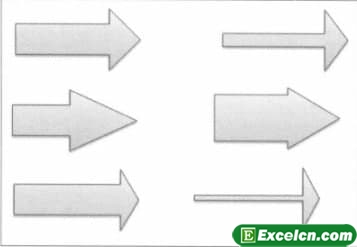 Excel有许多形状可以选择,但是有些时候想要的形状并不在该库中。在这种情况下,可以使用下面的技术来修改已有形状. .旋转形状:当选中一个形状的时候,它将会显示一个小绿点。单击并拖动这个小点可以旋转该形状。 .组合多个形状:可以通过合并两个或更多形状来创建想要的形状,然后组合它们。 .重新设置形状:许多形状在被选中时都会显示一个或多个小黄钻标记。可以单击并拖动这些标记来改变形状的轮廓。形状不同,具体的操作也会不同,因此需要试验观察结果。图显示了一个右箭头对象的不同变形(左上形状是默认的)。