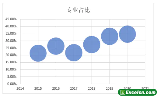 在Excel中执行数据分析时,我们可能会遇到一些需要从三个维度显示数据关系的数据。例如,下图所示页面摘自《 2020年中国用户体验产业发展研究报告》的图表,是一组显示从业人员专业背景趋势的数据。与二维折线图相比,该比例有一个附加的维度。此时,有必要使用气泡图来生成该图。