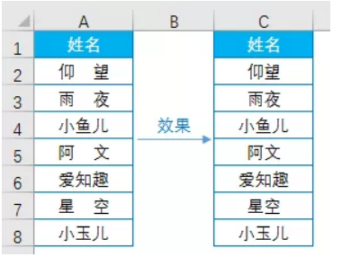 当我们输入员工的姓名时,有些员工名字里只有两个字,我们习惯在两个字中间加上一个空格,这样可以保证与名字有三个字的员工进行对齐,让人看起来比较舒服,可这样也有弊端,就是以后处理起来会很不方便,那该如何把空格给替换?